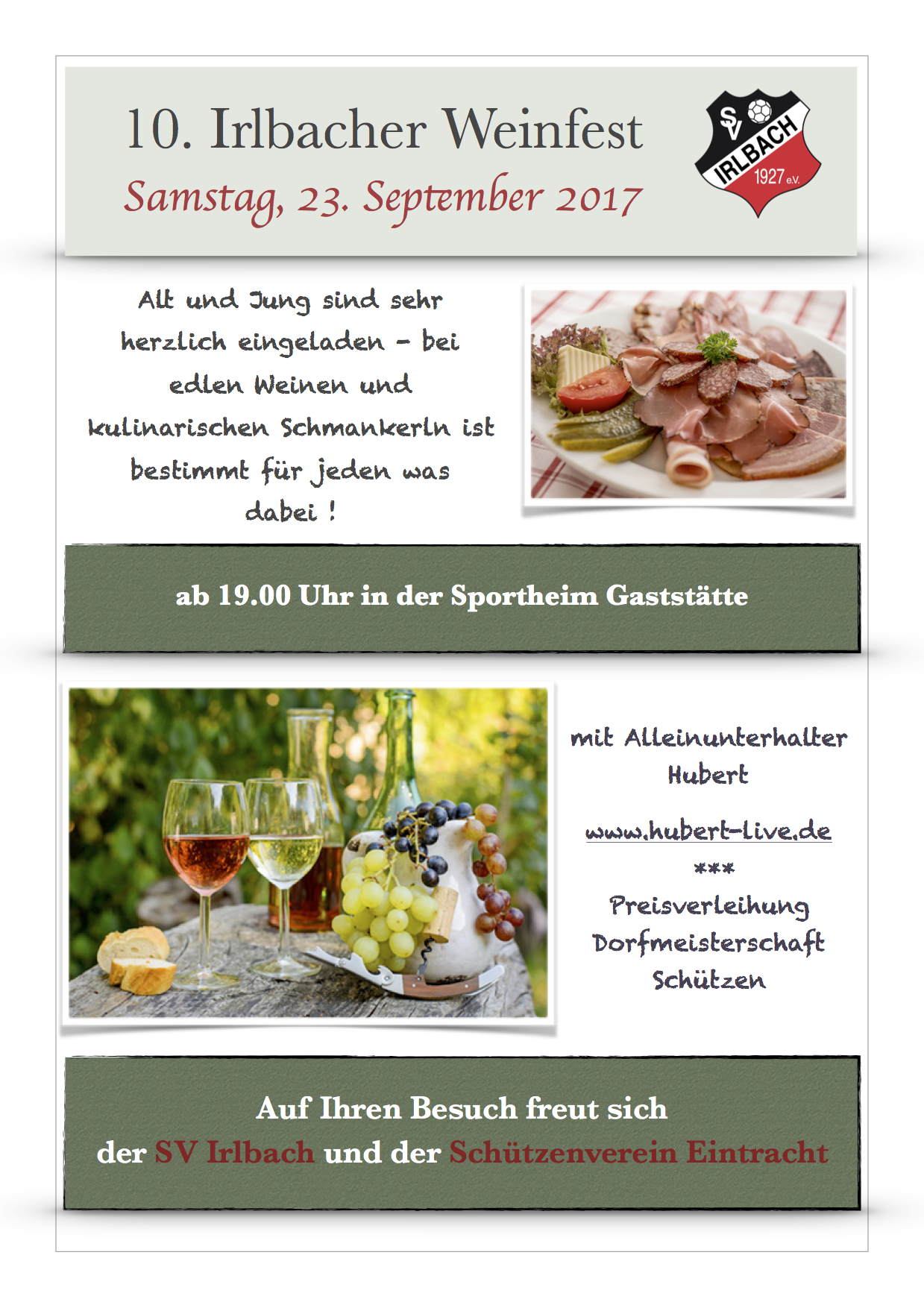 A-Jugend Anfahrt D-Jugend Datenschutz Der Verein F-Jugend Fitness und Gymnastik Home Impressum Kontakt Mannschaften test « Alle Veranstaltungen Diese Veranstaltung hat bereits stattgefunden. 10. Irlbacher Weinfest 23. September 2017 @ 19:00 - 24. September 2017 @ 2:00 « Ausschuß Sitzung 9-2017 Ausschuss Sitzung 9-2017 » Zum Kalender hinzufügen Google Kalender iCalendar Outlook 365 Outlook Live Details Beginn: 23. September 2017 @ 19:00 Ende: 24. September 2017 @ 2:00 Veranstalter SV Irlbach 1927 e. V. Telefon 09424 / 1291 E-Mail svirlbach@t-online.de Veranstalter-Website anzeigen Veranstaltungsort SV Irlbach 1927 e. V. Siedlungsweg 4 Irlbach, 94342 Deutschland Google Karte anzeigen Telefon 09424 / 1291
